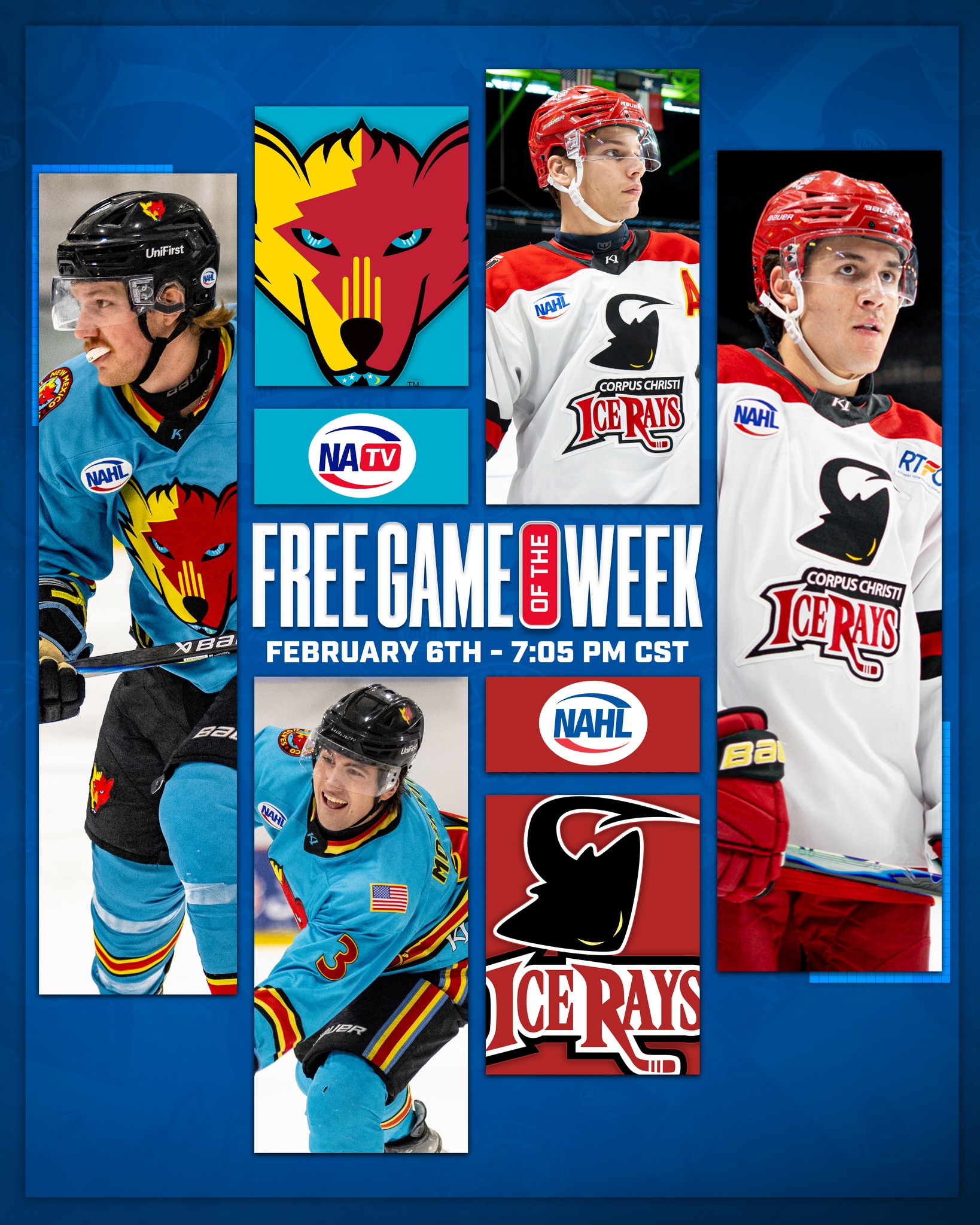 The Ice Wolves face off against the Corpus Christi IceRays at 6:05pm MT/7:05pm CT this Friday, Feb. 6 at the Hilliard Center in Corpus Christi, Texas. The matchup between the No. 3 Ice Wolves and No. 4 IceRays is featured as the NATV Free Game of the Week. Fans can watch the game live on NATV free of charge.