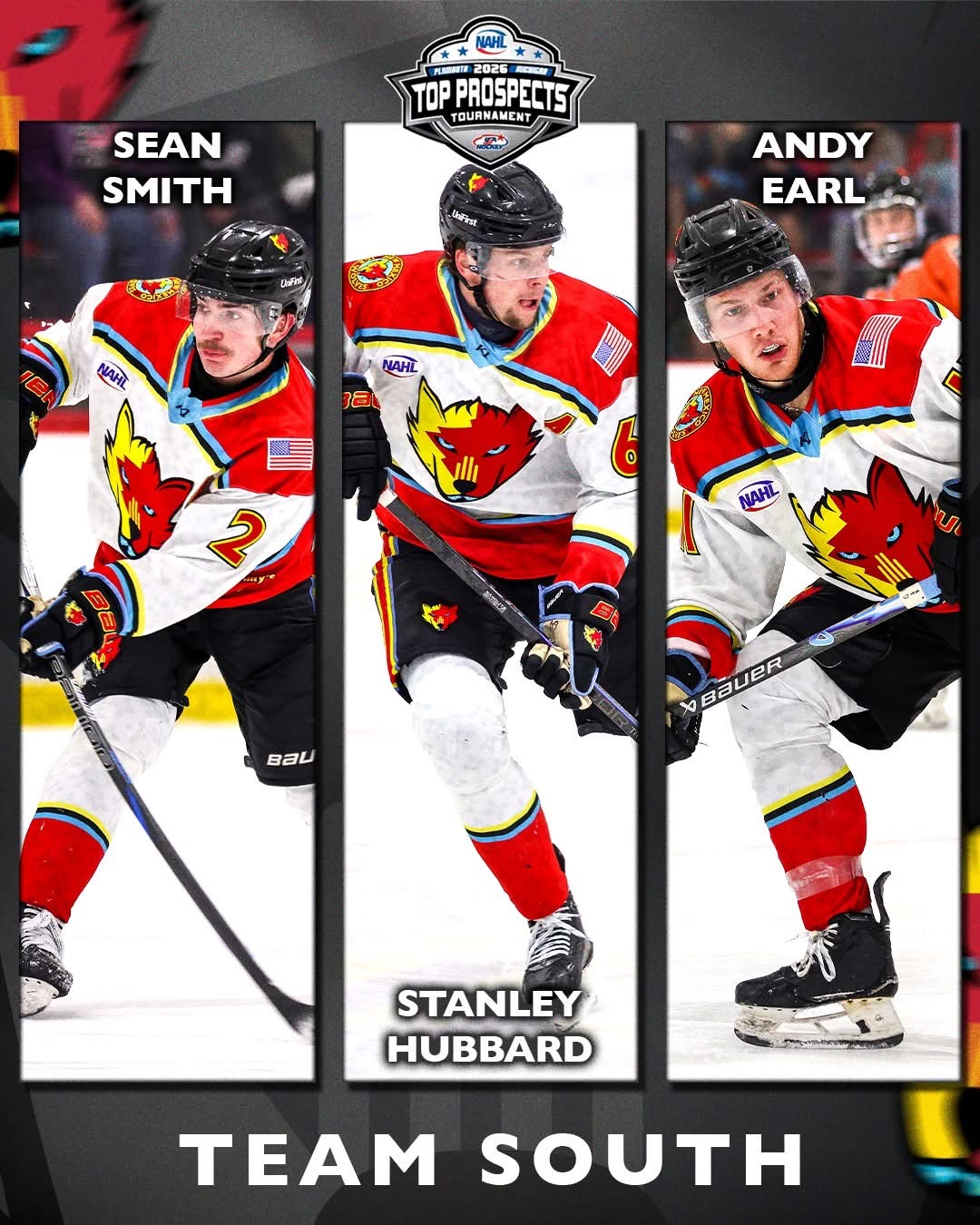 (Albuquerque, NM) Friday, January 30, 2026 —The New Mexico Ice Wolves® today announced that forwards Andy Earl and Stanley Hubbard, along with defensemen Sean Smith and Koen Harrold were named to play in the 2026 NAHL Top Prospects Tournament. Head Coach Kyle McKenzie was named assistant coach for the team representing the rugged NAHL South Division and team broadcaster Jason Thomas was named as one of two broadcasters selected league wide to provide play by play for the NAHL’s big event. Earl, Hubbard and Smith will play on Team South with Coach McKenzie as Assistant Coach for the team while Harrold will play on Selects Blue team and Thomas will help call 2026 Top Prospects Tournament games. The NAHL Top Prospects Tournament will be played at USA Hockey Arena in Plymouth, Michigan February 16-17, 2026.