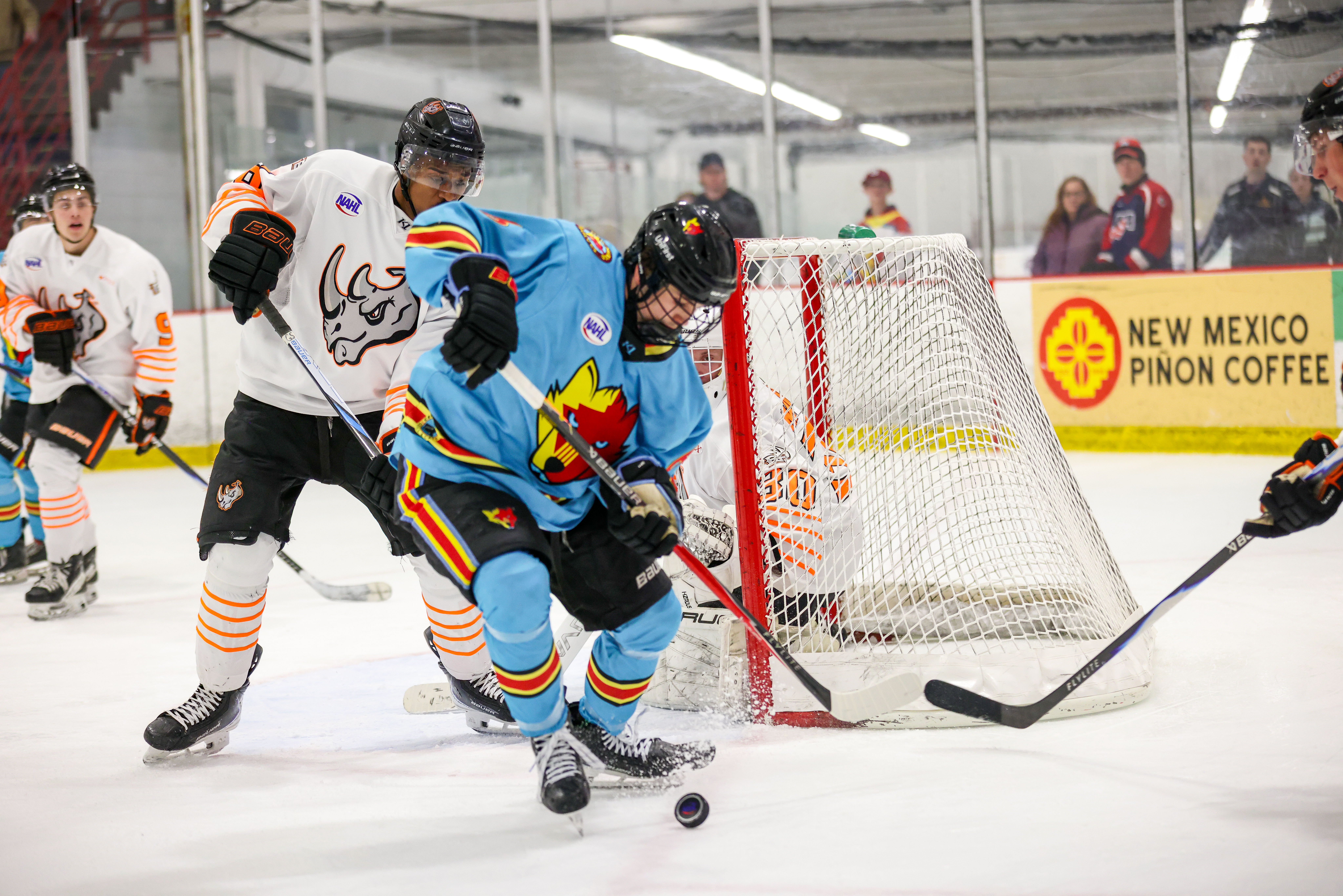 The New Mexico Ice Wolves took on the El Paso Rhinos in game one of the best of five division semifinal series. The Rhinos jumped out to an early lead as Ethan Woolcott would score shorthanded. Sean Smith would respond tying the game with under seven minutes to go in the first period. Jacob Solano would score with three minutes remaining in the opening period for the 2-1 lead. The Ice Wolves came out firing scoring three goals in the second period two goals from Nayan Pai and one goal from Andrey Moskvitin. Ian Kastamo would get the lone El Paso goal in the second period as the Ice Wolves would take a one goal lead into the third period. Brock Fairbanks would give the Ice Wolves their first two goal lead of the postseason with under eight minutes to go in regulation. The Rhinos would storm back scoring a powerplay goal from Ethan Woolcott and then a goal with the extra attacker courtesy of Kamden Kaiser to tie the game with just 1:19 remaining. In Overtime Alexander Stephen would score at the 10:57 mark to give the Rhinos the victory in game one. The teams will meet in game two Saturday, April 18 at 6:30pm MT.